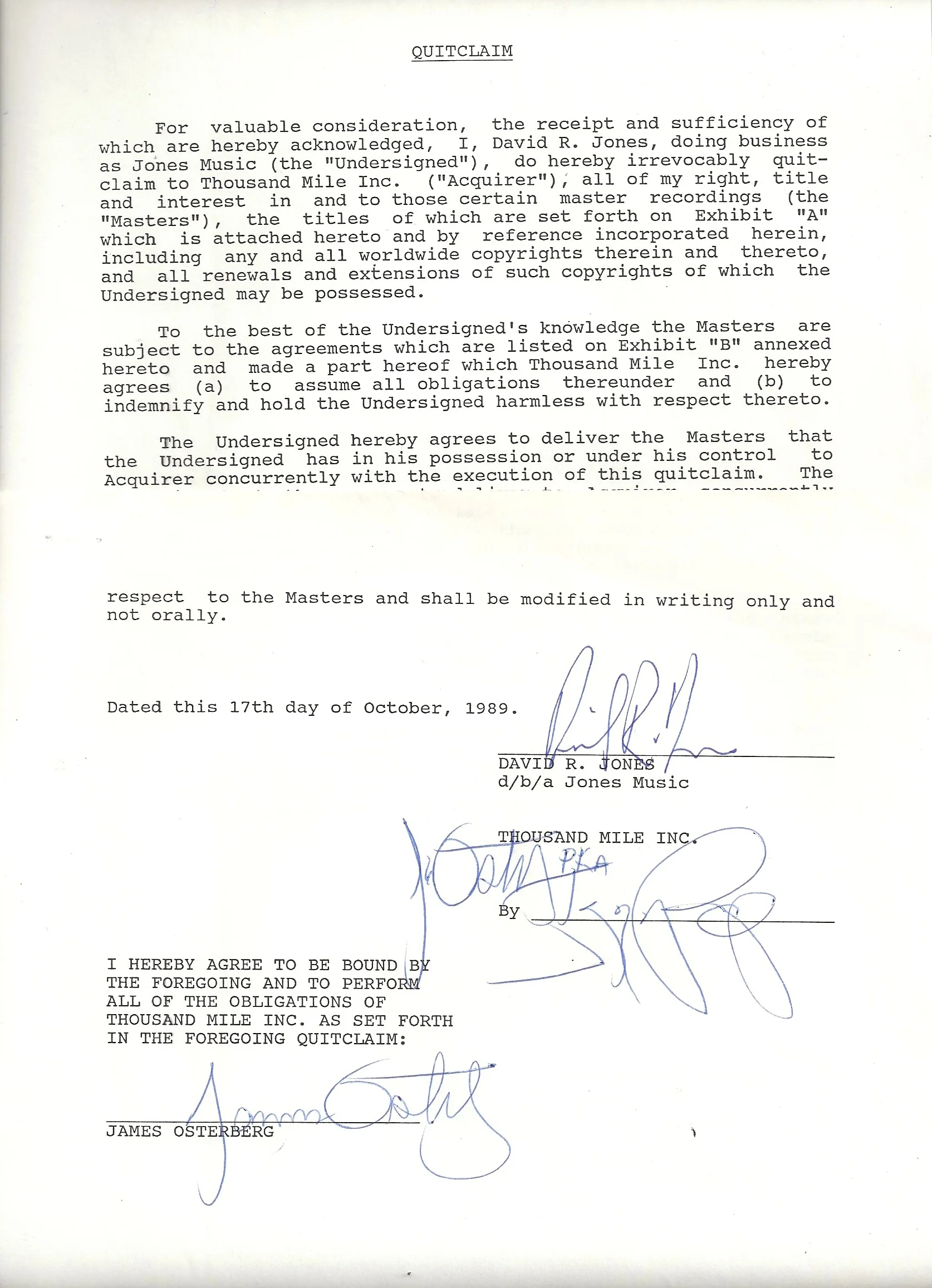 A Quitclaim document between Jones and Ostenberg in which Jones Music quitclaims to Thousand Mile Inc all of the rights, titles and interests with certain 'Master' recordings. Signed in blue pen by both Iggy Pop and David Bowie (David R. Jones)