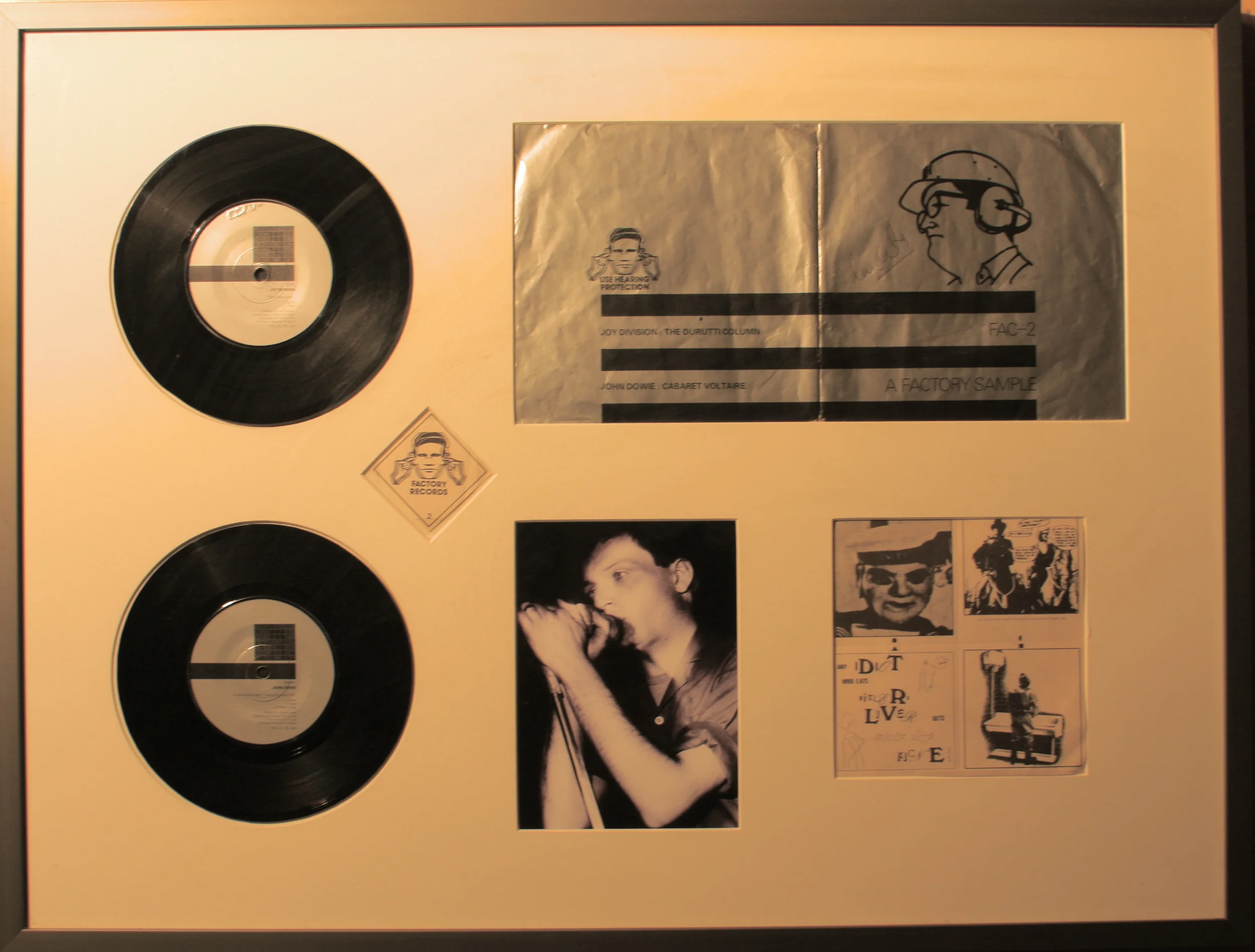 Joy Divison- Fac 2. Original 1st press demo Fac 2. Signed on the sleeve by Ian Curtis. designed by Peter Saville. Mounted with the original stickers. Framed with UV protective glass- £SOLD
